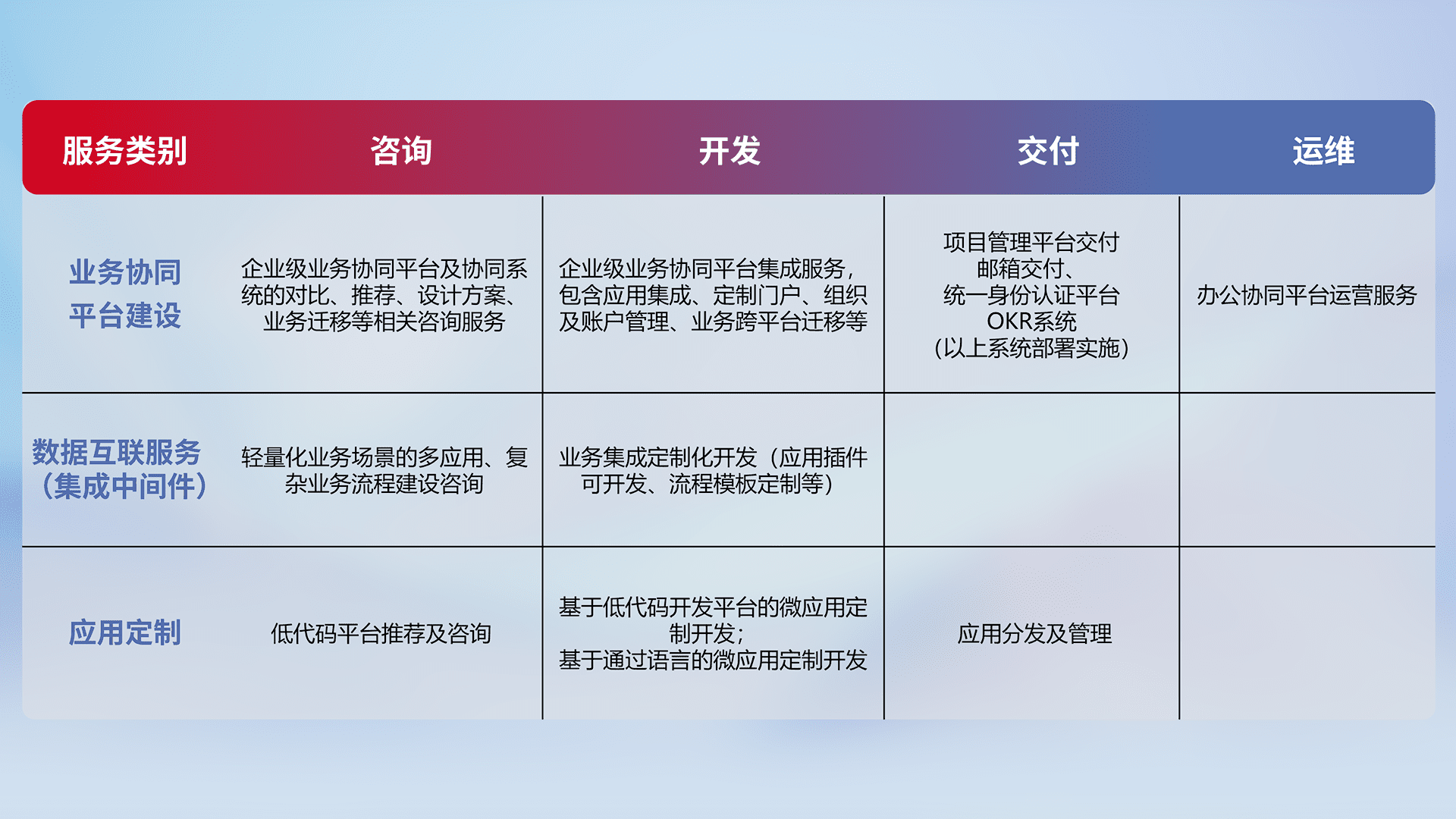 针对钉钉、、企微、、、、IDaas等平台级产品提供产品的规划、、、、方案、、、、交付、、、、定制化开发等服务,,实现如统一协同办公、、智能客户服务、、、混合会议管理、、智能数据查询、、、等业务场景,,,实现数字化转型。。。