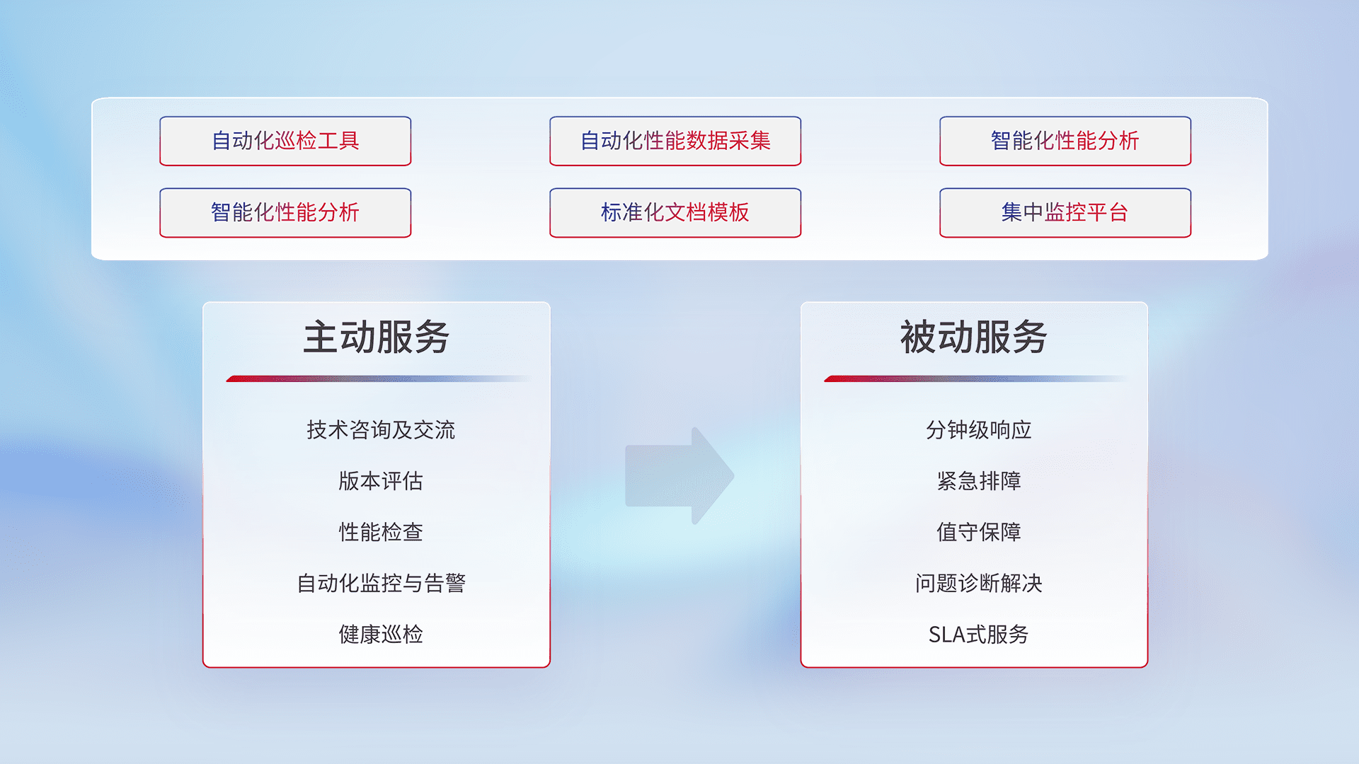 智能化工具和标准化文档,,,保障服务质量,,,,提供主动服务(包含技术咨询、、、版本评估、、、、性能检查、、自动化监控与告警、、、健康巡检)和被动服务包含(分钟级响应、、、紧急排障、、、、值守保障、、、问题诊断解决、、SLA服务)。。